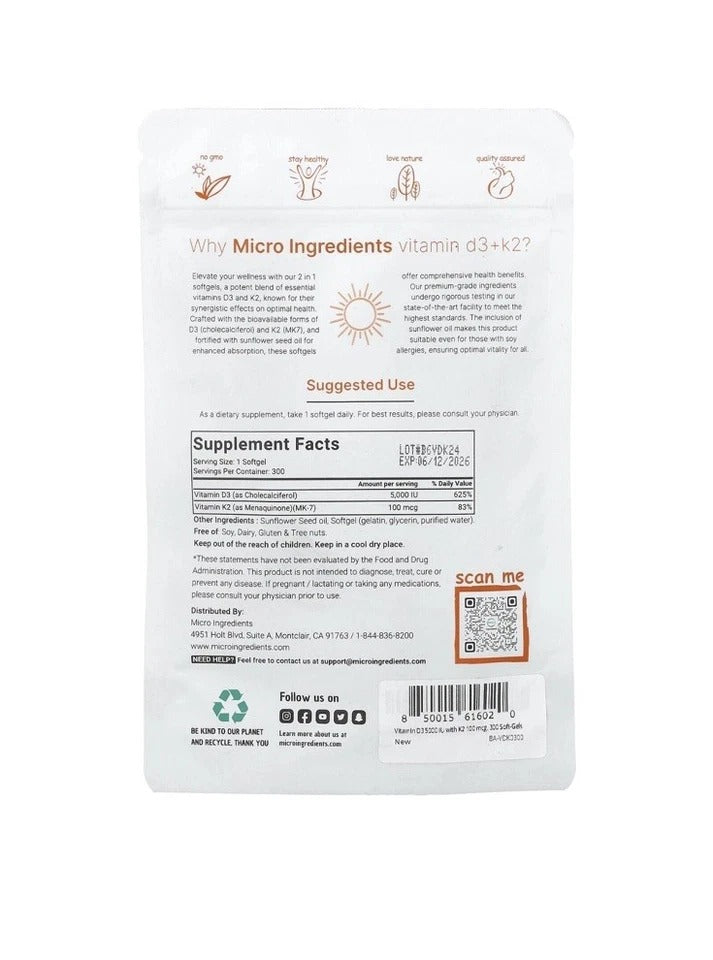 š Micro Ingredients Vitamin D3 + K2 2-in-1 softgels are designed for optimal bone, heart, and immune health. Each serving contains 5000 IU of Vitamin D3 and 100mcg of Vitamin K2 (MK-7), mixed with sunflower oil for superior absorption. This powerful duo aids in directing calcium to bones and keeping arteries clear. Non-GMO, gluten-free, soy-free, and free of dairy and additives.
