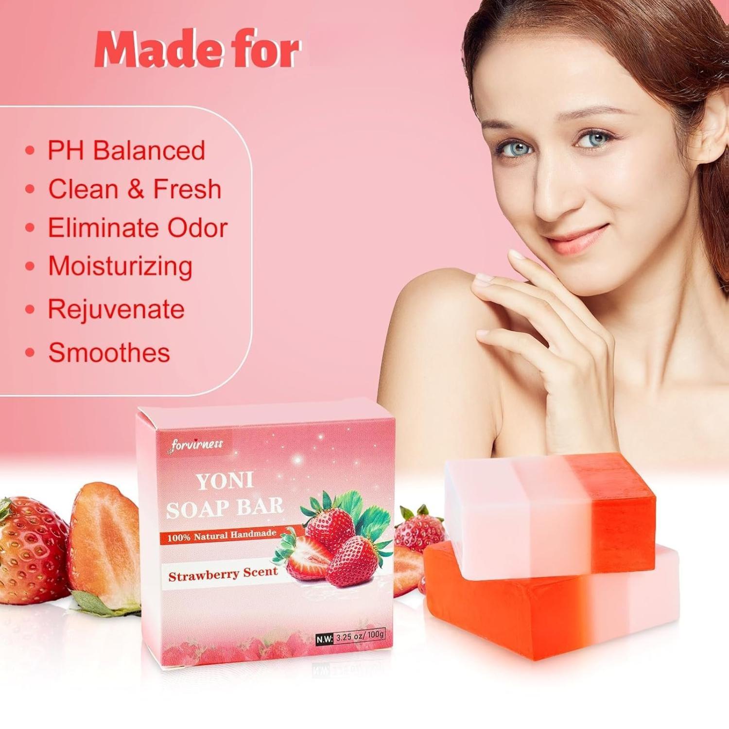 โข The strawberry-scented yoni bar soap reclaims your body, leaving you refreshed and confident. It's a great addition to your skincare products, ensuring cleanliness and a pleasant smell. Wake up feeling rejuvenated and self-assured.